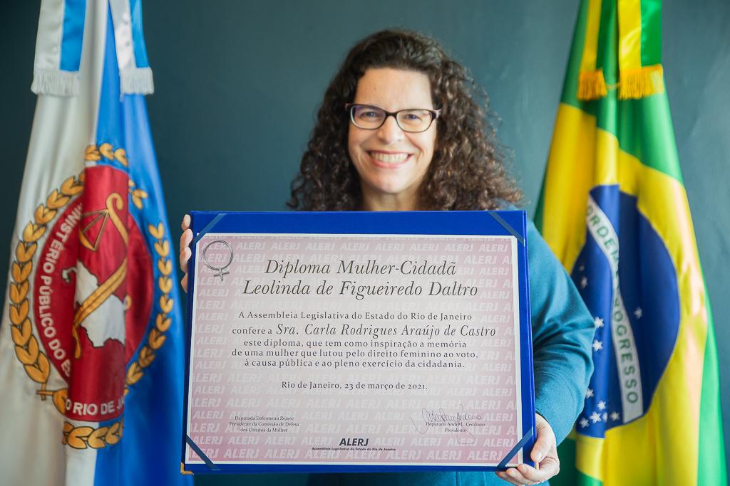 A procuradora de Justiça Carla Rodrigues Araújo de Castro recebeu, nesta quarta-feira (28/04), da Comissão da Alerj de Defesa dos Direitos da Mulher (CDDM/Alerj) o diploma Mulher Cidadã Leolinda de Figueiredo Daltro, homenagem da Assembleia Legislativa destinada a mulheres que contribuíram de maneira relevante para a defesa dos direitos da mulher e questões de gênero no Estado do Rio de Janeiro.