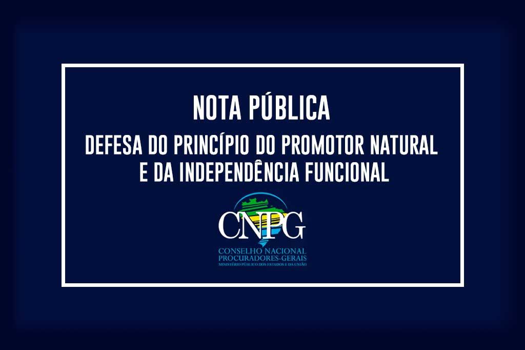 O Conselho Nacional dos Procuradores-Gerais do Ministério Público dos Estados e da União (CNPG) manifesta-se publicamente em defesa dos princípios do promotor natural e da independência funcional, opondo-se, por consequência, a quaisquer compreensões e/ou movimentações que possam fragilizar tais postulados, tão fundamentais à estrutura da instituição Ministério Público, ao sistema acusatório e ao sistema de freios e contrapesos.