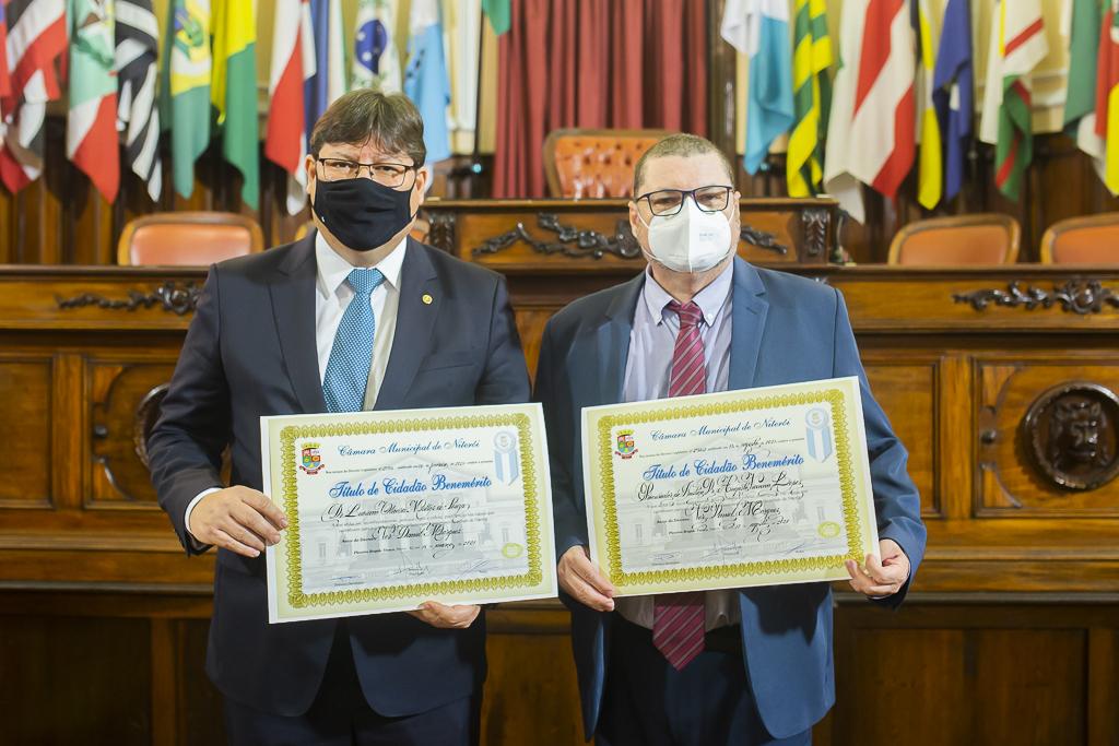 O procurador-geral de Justiça, Luciano Mattos, e o ouvidor do Ministério Público do Estado do Rio de Janeiro (MPRJ), procurador de Justiça Augusto Vianna Lopes, foram agraciados na noite desta terça-feira (17/08) com o Título de Cidadão Benemérito do município de Niterói. A cerimônia ocorreu da Câmara Municipal da cidade com a presença de familiares e autoridades.
