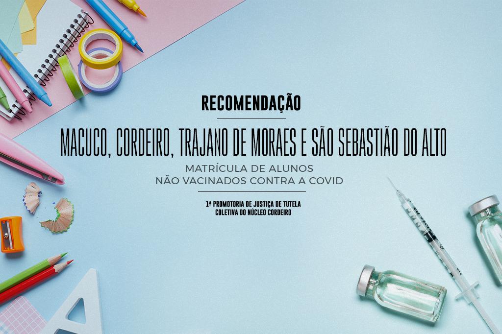 O Ministério Público do Estado do Rio de Janeiro (MPRJ), por meio da 1ª Promotoria de Justiça de Tutela Coletiva do Núcleo Cordeiro, expediu Recomendações para que as prefeituras de Macuco, Cordeiro, Trajano de Moraes e São Sebastião do Alto realizem campanhas de conscientização sobre da necessidade de vacinação das crianças e adolescentes contra a Covid. Os documentos também pedem a adoção de protocolos para a busca ativa das crianças em idade escolar que não estejam matriculadas na rede de ensino e das matriculadas que ainda não receberam o imunizante.