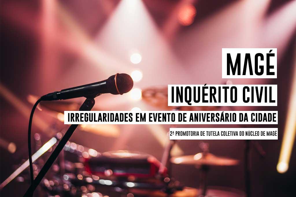 O Ministério Público do Estado do Rio de Janeiro (MPRJ), por meio da 2ª Promotoria de Tutela Coletiva do Núcleo de Magé, instaurou dois inquéritos civis para apurar possíveis irregularidades em evento promovido pela prefeitura de Magé para comemorar o aniversário de 457 anos da cidade. O primeiro trata de possíveis irregularidades e suposto superfaturamento na contratação de artistas e de serviços para a realização dos shows. O segundo apura as condições do local onde será realizado o evento de comemoração.