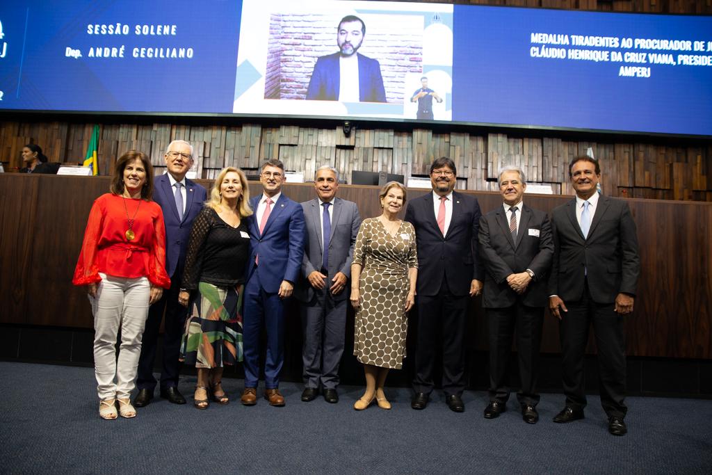 O presidente da Associação do Ministério Público do Estado do Rio de Janeiro (AMPERJ), procurador de Justiça Claudio Henrique da Cruz Viana, recebeu, nesta quarta-feira (14/12), Dia Nacional do Ministério Público, a Medalha Tiradentes, a mais importante condecoração do legislativo fluminense. A medalha foi entregue pelo presidente da Assembleia Legislativa do Estado do Rio de Janeiro (Alerj), deputado André Ceciliano e pelos filhos de Claudio Henrique, Antonio e Henrique, em solenidade realizada no Plenário da Alerj. A honraria é concedida pelo Governo do Estado do Rio de Janeiro a pessoas que prestaram serviços relevantes à causa pública.