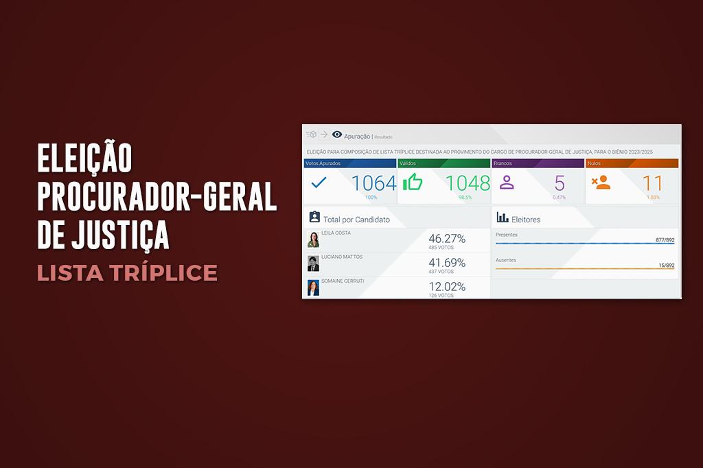 O Ministério Público do Estado do Rio de Janeiro (MPRJ) realizou, nesta segunda-feira (12/12), a eleição destinada à formação da lista tríplice para provimento do cargo de procurador-geral de Justiça do Rio de Janeiro durante o biênio 2023/2025. Leila Machado Costa foi a candidata mais votada com 485 votos (46,27% do total). Em segundo, Luciano Mattos obteve 437 votos (41,69%) e, em terceiro lugar, Somaine Cerruti somou 126 votos (12,02%).