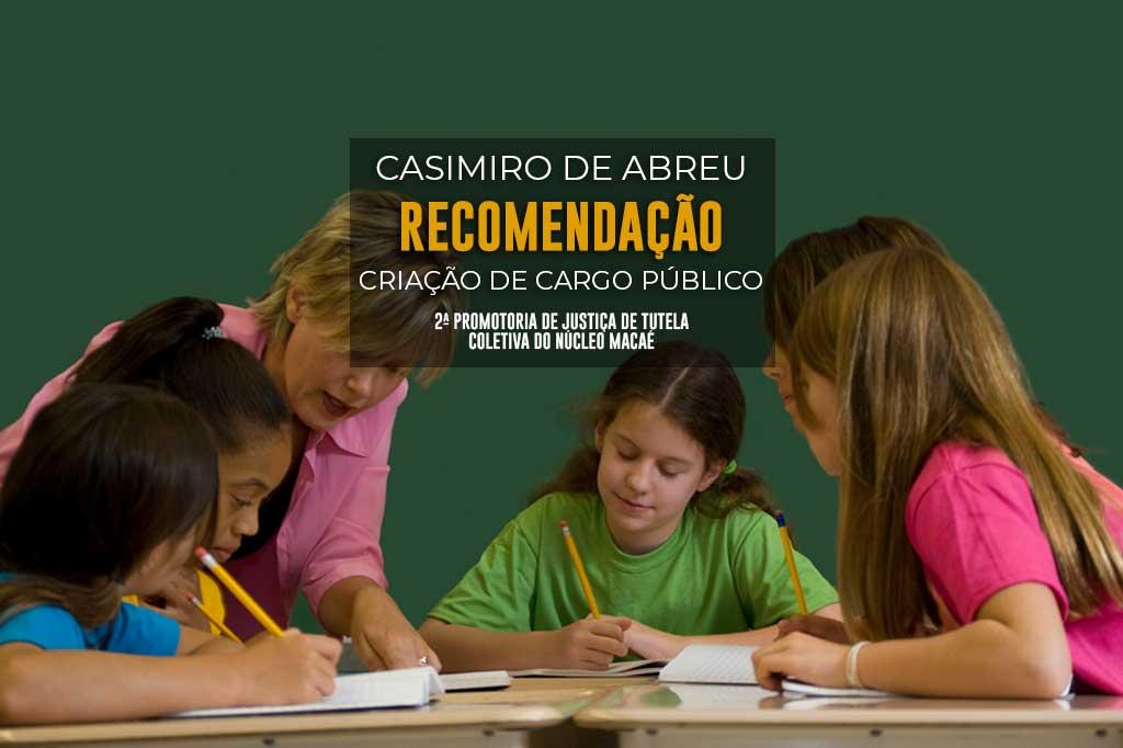 A 2ª Promotoria de Justiça de Tutela Coletiva do Núcleo Macaé expediu, nesta quinta-feira (09/02), uma Recomendação à prefeitura de Casimiro de Abreu para que crie na estrutura administrativa municipal, em um prazo máximo de 30 dias, a função de mediador para atuação em escolas públicas. O pedido, que tem um prazo de dez dias para ser respondido, acontece após o MPRJ tomar ciência de que pessoas selecionadas pela Prefeitura no processo seletivo simplificado nº. 01/2021, realizado pela Secretaria Municipal de Educação para a contratação temporária de professores, estão atuando como mediadores na rede pública municipal de ensino.
