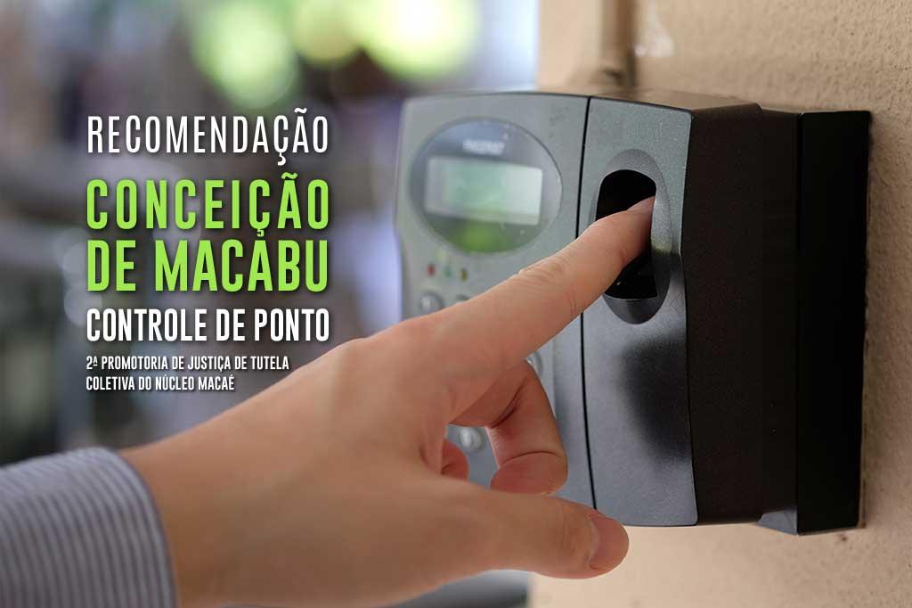 O Ministério Público do Estado do Rio de Janeiro (MPRJ), por meio da 2ª Promotoria de Justiça de Tutela Coletiva do Núcleo Macaé, expediu, no dia 21 de março, Recomendação ao prefeito de Conceição de Macabu, a fim de providenciar, no prazo máximo de 120 dias, a instalação e regular funcionamento de controle eletrônico de frequência de todos os servidores do município que ainda não registram o ponto desta maneira. E acrescenta que, até a devida implementação do sistema, seja mantido um rigoroso controle formal e diário da assiduidade, de maneira que fiquem registrados, em cada período trabalhado, os horários corretos de entrada e saída.