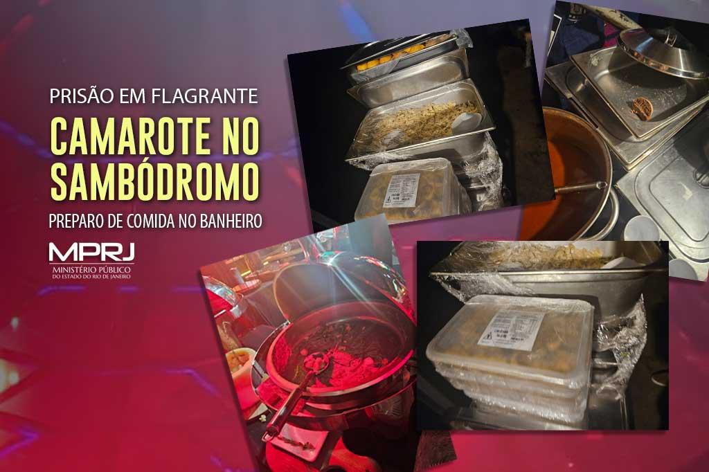 O Ministério Público do Estado do Rio de Janeiro (MPRJ) efetuou duas prisões em flagrante, na noite de domingo (11/02), no Sambódromo. Foram presas as responsáveis pelo camarote Lounge Sapucaí e pelo fornecimento de alimentação no local, por armazenamento impróprio de alimentos. De acordo com a Promotoria de Justiça que atuou no plantão judiciário, os alimentos servidos aos convidados estavam sendo preparados no sanitário masculino, junto a objetos como meias e mochilas. Cerca de 500 quilos de alimentos encontrados no sanitário e no camarote foram descartados pela equipe de fiscalização.