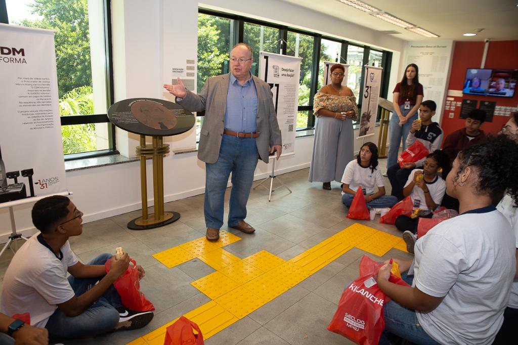 O Ministério Público do Estado do Rio de Janeiro (MPRJ), por meio do Centro de Memória Procurador de Justiça João Marcello de Araújo Júnior (CDM/MPRJ), recebeu, nesta quinta-feira (14/03), alunos e professores da Escola Municipal Joaquim da Silva Gomes, de Santa Cruz, para uma visita guiada à sua sede, como parte do Projeto Caminhos da Cidadania.
