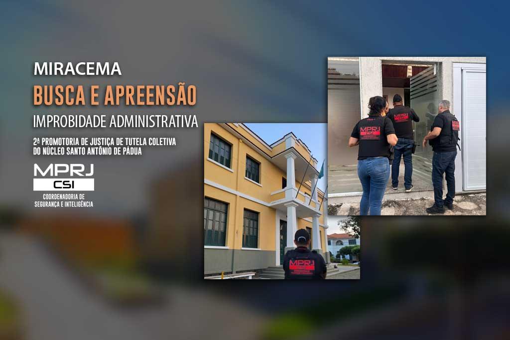 O Ministério Público do Estado do Rio de Janeiro (MPRJ), por meio da 2ª Promotoria de Justiça de Tutela Coletiva do Núcleo Santo Antônio de Pádua e da Coordenadoria de Segurança e Inteligência (CSI/MPRJ), realiza operação na manhã desta sexta-feira (17/05), para cumprir mandados de busca e apreensão em endereços ligados ao prefeito de Miracema, Clóvis Tostes de Barros, e à secretária municipal de Saúde, Vanessa Gutterres Silva. O MPRJ obteve na Justiça o afastamento de sigilo de dados para que possa ter acesso e extrair qualquer conteúdo armazenado nos materiais apreendidos.