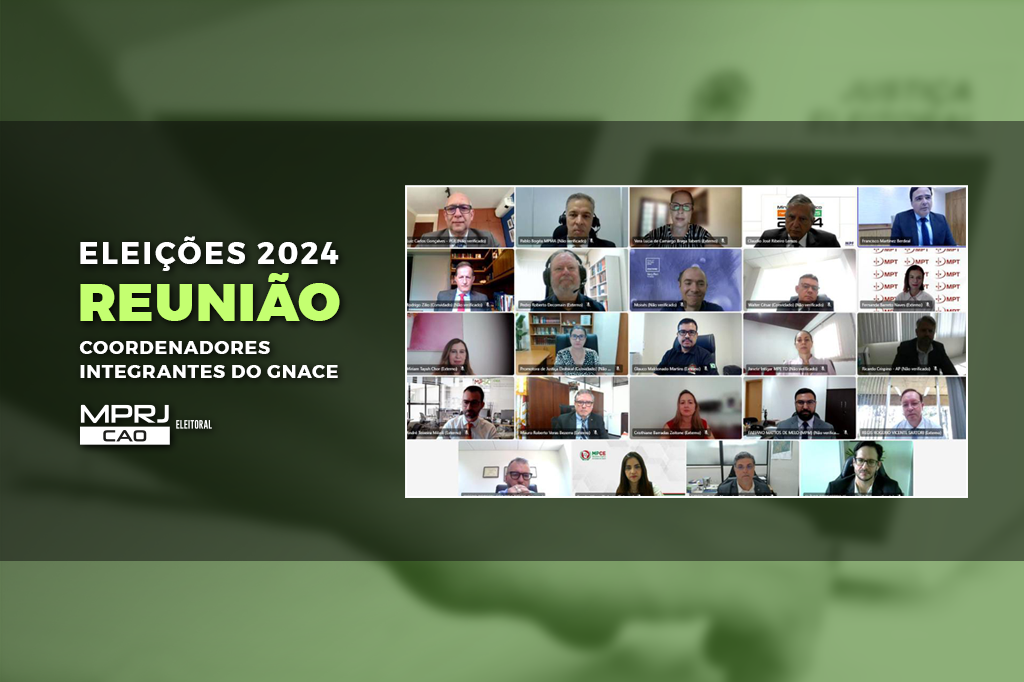 O Ministério Público do Estado do Rio de Janeiro (MPRJ), por meio do Centro de Apoio Operacional das Promotorias Eleitorais (CAO Eleitoral/MPRJ), participou, na quinta-feira (26/09), de uma reunião online promovida pelo Grupo Nacional de Coordenadores Eleitorais (GNACE) do Conselho Nacional de Procuradores-Gerais dos Ministérios Públicos dos Estados e da União (CNPG). O objetivo era alinhar a atuação dos promotores eleitorais de todo o país para as próximas eleições. Pelo MPRJ, participaram as promotoras de Justiça Miriam Tayah Chor e Cristhiane Barradas Zeitone, respectivamente coordenadora e subcoordenadora do CAO Eleitoral e integrantes do GNACE.