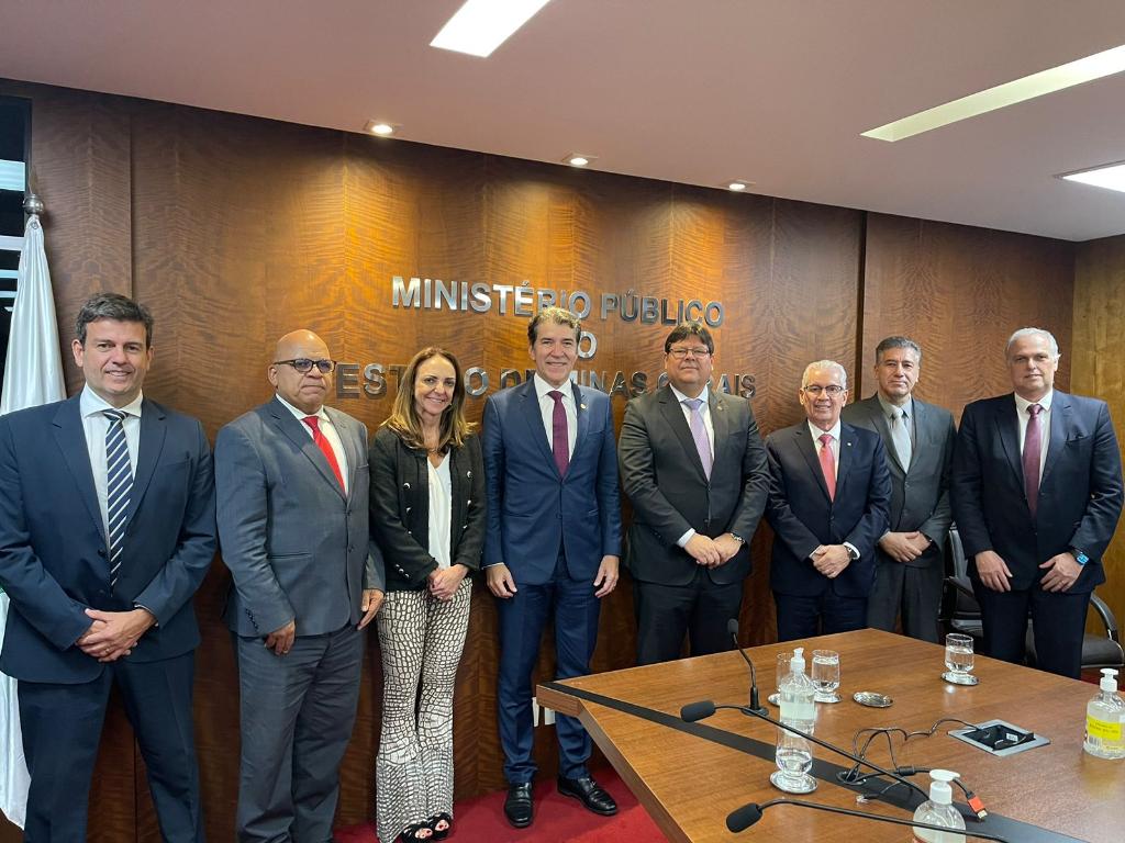 O procurador-geral de Justiça, Luciano Mattos, e os PGJs de Minas Gerais, Jarbas Soares Júnior; de São Paulo, Paulo Sérgio de Oliveira e Costa; e do Espírito Santo, Francisco Martínez Berdeal, que compareceu virtualmente, participaram, na tarde desta segunda-feira (21/10), na sede do Ministério Público do Estado de Minas Gerais (MPMG), de mais uma edição do Encontro de Procuradores-Gerais de Justiça da Região Sudeste. A reunião debateu formas de cooperação e unidade institucional.