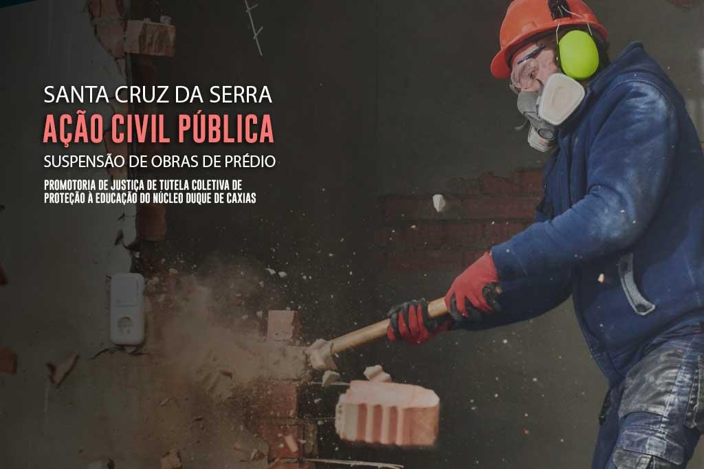 O Ministério Público do Estado do Rio de Janeiro (MPRJ), por meio da Promotoria de Justiça de Tutela Coletiva de Proteção à Educação do Núcleo Duque de Caxias, ajuizou nesta quinta-feira (12/12) uma Ação Civil Pública para que o Município de Duque de Caxias interrompa as obras de um prédio localizado em Santa Cruz da Serra. A ação também tem como alvos o prefeito Wilson Miguel dos Reis, o secretário municipal de Obras e Defesa Civil, Wilson Miguel dos Reis, e o engenheiro João Carlos Grilo Carletti.