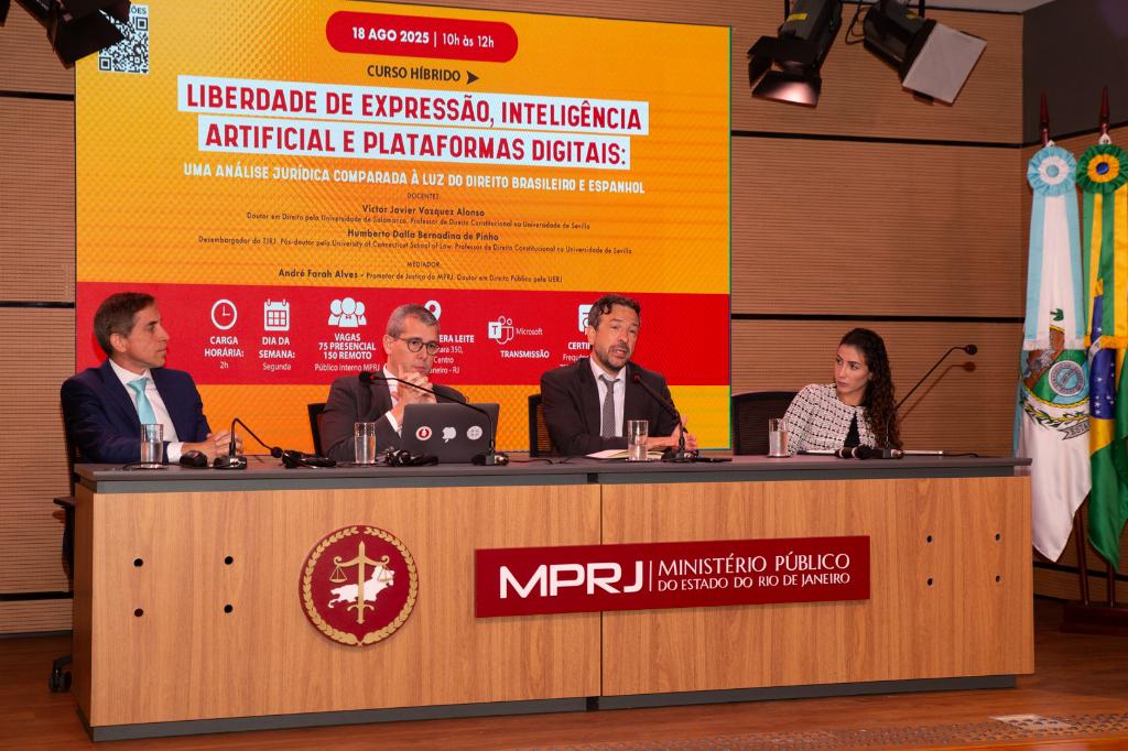 O Ministério Público do Estado do Rio de Janeiro, por meio da Assessoria Internacional e do Instituto de Educação Roberto Bernardes Barroso (IERBB/MPRJ), realizou, na segunda-feira (18/08), o curso híbrido “Liberdade de expressão, inteligência artificial e plataformas digitais: uma análise jurídica comparada à luz do Direito brasileiro e espanhol”. O evento, realizado no auditório Procuradora de Justiça Vera de Souza Leite, reuniu especialistas para debater a influência que as novas tecnologias têm exercido na sociedade ao redor do mundo.