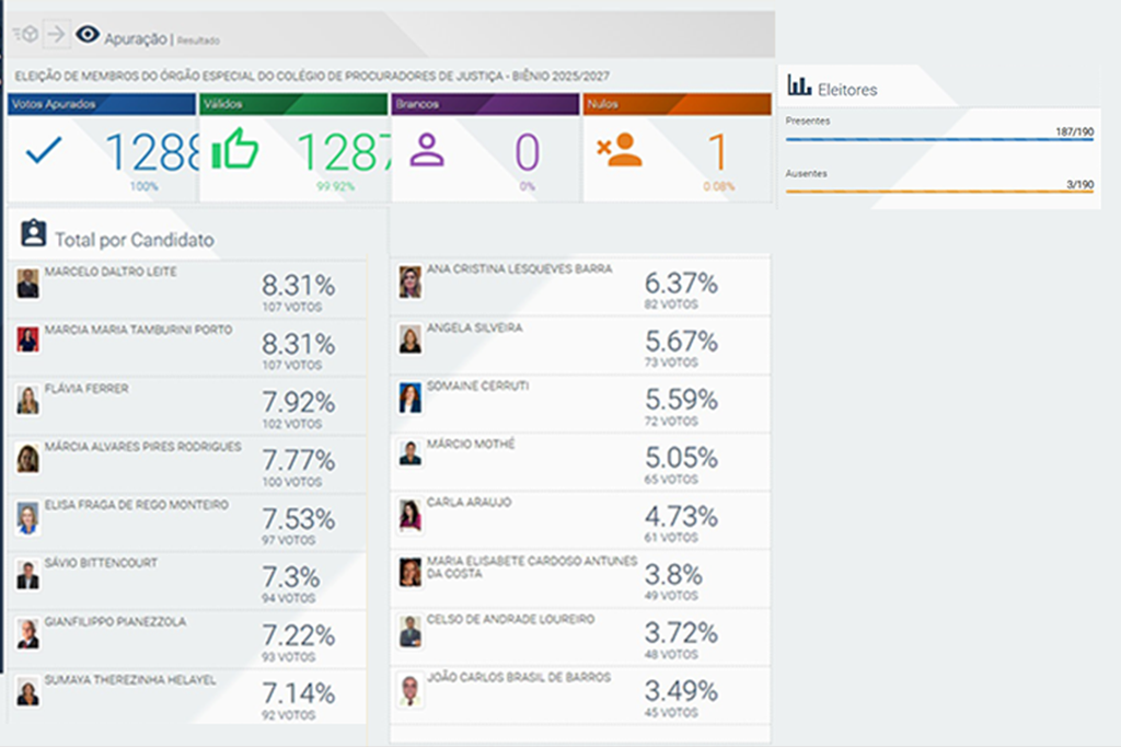 O Ministério Público do Estado do Rio de Janeiro (MPRJ) realizou, nesta segunda-feira (25/08), a eleição para a composição do Órgão Especial do Colégio de Procuradores de Justiça. Foram eleitos dez procuradores de Justiça, que tomarão posse em 24 de setembro e exercerão seus mandatos de 25 de setembro de 2025 a 24 de setembro de 2027. A votação ocorreu das 10h às 17h, por meio do sistema eletrônico, e registrou 1.288 votos, sendo um nulo e nenhum em branco.