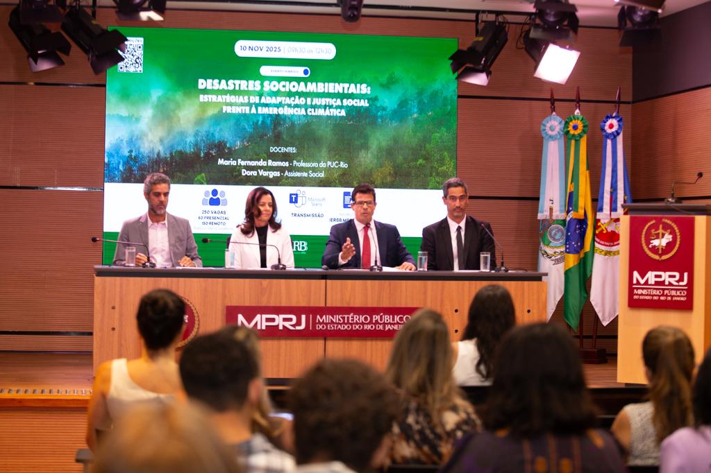 O Ministério Público do Estado do Rio de Janeiro (MPRJ), por meio da Comissão Permanente de Estudos em Desastres Socioambientais do Instituto de Educação Roberto Bernardes Barroso (IERBB/MPRJ), realizou, nesta segunda-feira (10/11), o evento “Desastres Socioambientais: ordem desigual, processos de vulnerabilização e desafios às práticas públicas”, no auditório Vera Leite do MPRJ. A atividade marcou a reunião de abertura da Comissão, com o objetivo de discutir os impactos da crise climática e os desafios da atuação ministerial na formulação e fiscalização de políticas públicas.
