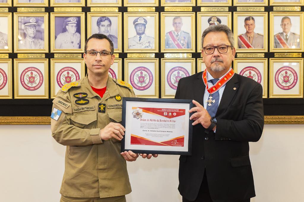 O procurador-geral de Justiça, Antonio José Campos Moreira, recebeu, nesta quarta-feira (10/12), a Medalha da Ordem do Mérito do Corpo de Bombeiros Militar, no Grau Grande-Oficial, em solenidade realizada no Salão Nobre do Comando-Geral, no Centro do Rio. A honraria, uma das mais importantes da corporação, é concedida a personalidades civis e militares que prestaram serviços notáveis à instituição ou à sociedade. A medalha foi entregue ao PGJ pelo comandante-geral do Corpo de Bombeiros e secretário de Estado de Defesa Civil (SEDEC-RJ), Tarciso Antônio de Salles Junior.