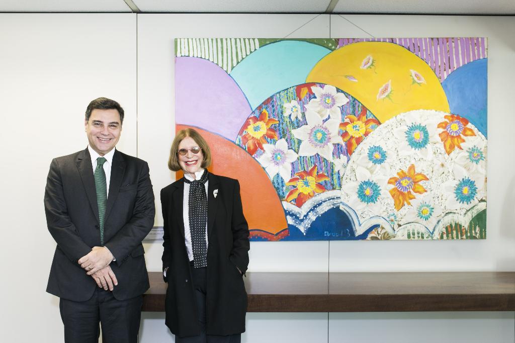 O procurador-geral de Justiça, Eduardo Gussem, recebeu a artista plástica Abigail Vasthi Schlemm na sede do Ministério Público do Estado do Rio de Janeiro (MPRJ), nesta quarta-feira (02/08). O encontro oficializou a doação feita pela artista ao MPRJ da obra “Está Chovendo na Roseira”, que apresenta flores multicoloridas e se encontra exposta com destaque na antessala do gabinete do procurador-geral.