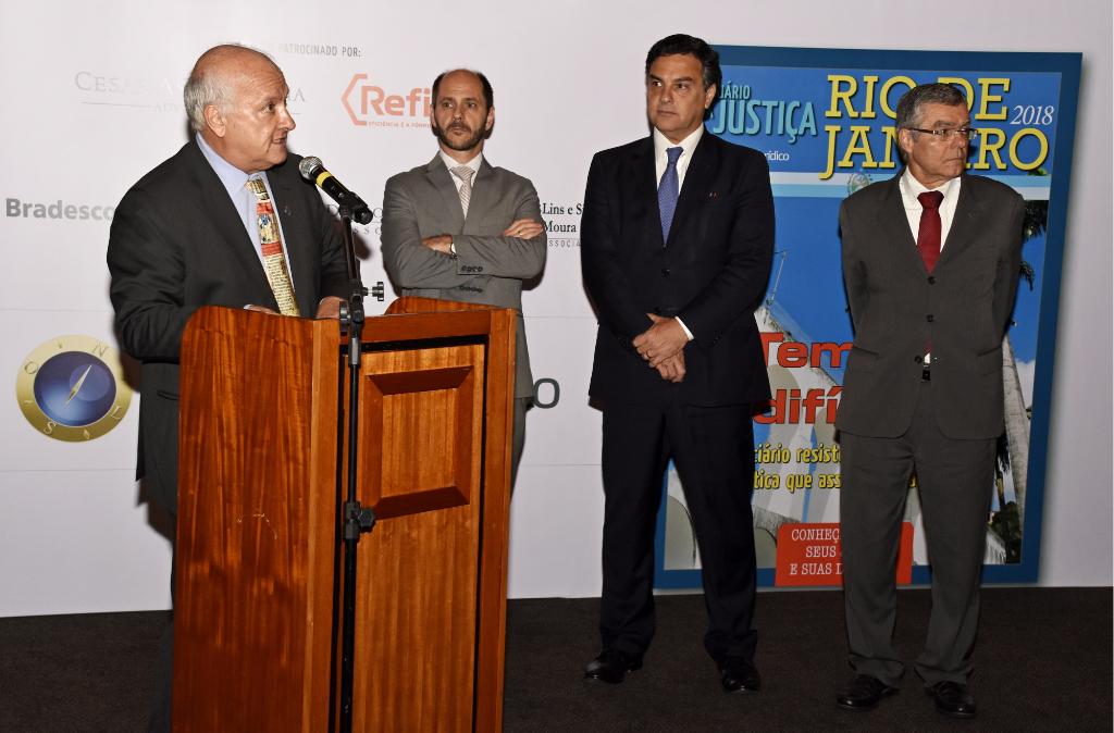 O procurador-geral de Justiça, Eduardo Gussem, participou da cerimônia do lançamento da edição 2018 do Anuário da Justiça Rio de Janeiro, na noite desta quarta-feira (29/11), na sede do Tribunal de Justiça do Estado do Rio. Mais de 150 convidados entre juízes, desembargadores, membros do Ministério Público e da advocacia prestigiaram o evento que contou ainda com a presença do presidente do TJRJ, desembargador Milton Fernandes de Souza e do defensor público-geral do Estado do Rio de Janeiro, André Luís Machado de Castro