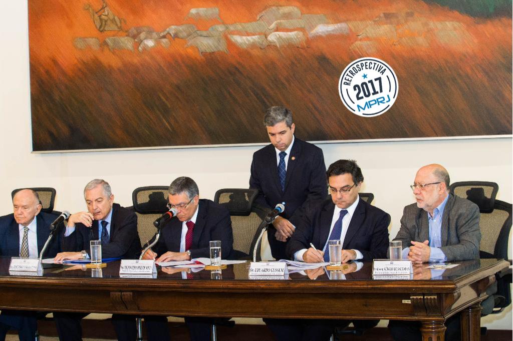 O Ministério Público do Estado do Rio de Janeiro (MPRJ) e o Tribunal de Justiça do Estado do Rio de janeiro (TJRJ) assinaram, nesta terça-feira (12/12), um Termo de Convênio que tem por objetivo a cooperação para compra compartilhada entre as instituições. O acordo foi assinado pelo procurador-geral de Justiça, Eduardo Gussem, e pelo presidente do TJRJ, desembargador Milton Fernandes, durante a apresentação do Balanço Sustentável do Tribunal de Justiça. Também compuseram a mesa o procurador-geral do Tribunal de Contas do Estado, Sérgio Cavalieri, o desembargador Jessé Torres Pereira Junior e o economista Sérgio Besserman, presidente do Jardim Botânico do Rio.