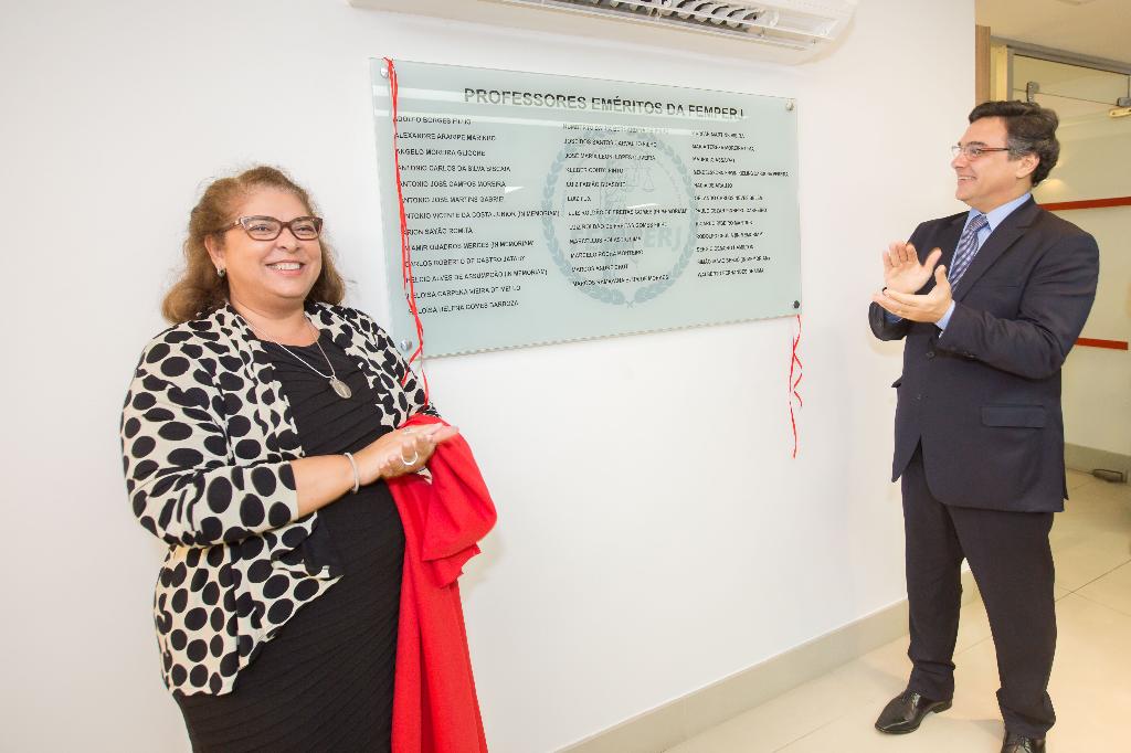 Depois da entrega do título de professor emérito, Gussem e Lilian Pinho inauguraram a placa comemorativa com o nome de cada um dos agraciados. São eles: