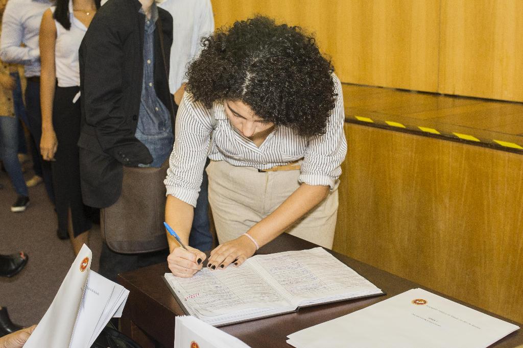 O estudante Victor Ferreira, aluno da UFRJ e primeiro colocado no concurso para a Capital, leu o Termo de Compromisso da primeira parte da sessão de posse, acompanhado por todos os aprovados. Na segunda sessão, destinada aos 288 alunos que realizarão seus estágios nas Promotorias do interior, o responsável pela leitura do termo foi Igor de Souza, aluno da Faculdade de Direito de Valença. O estágio forense tem duração máxima de dois anos.