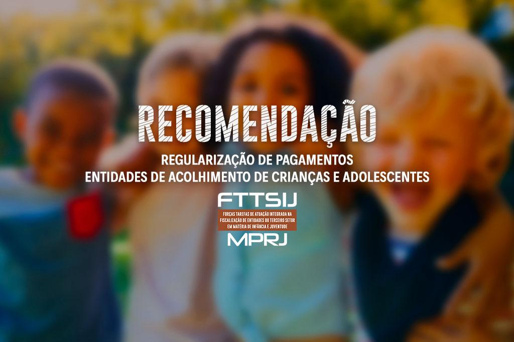 O Ministério Público do Estado do Rio de Janeiro (MPRJ), por meio da Força-Tarefa de Atuação Integrada na Fiscalização de Entidades do Terceiro Setor em Matéria de Infância e Juventude (FTTSIJ/MPRJ), entregou, em 19/10, recomendação aos secretários municipais de Fazenda e de Assistência Social para que o poder público, no prazo de 20 dias, regularize os pagamentos, referentes ao ano de 2018, às entidades de acolhimento (abrigos) de crianças e adolescentes conveniados à prefeitura.