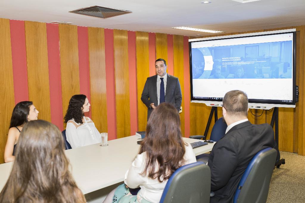 O procurador-geral de Justiça, Eduardo Gussem, recebeu nesta quinta-feira (24/01), um grupo de 15 estudantes de Direito da PUC-Rio (Pontifícia Universidade Católica do Rio de Janeiro) para apresentar os projetos do Ministério Público do Estado do Rio de Janeiro (MPRJ) na área tecnológica. O grupo de alunos do 3º período, liderado pela professora Flávia Limmer, conheceu as instalações da plataforma digital ‘MP em Mapas’ e foi apresentado por Gussem aos conceitos desenvolvidos atualmente pelo MPRJ nas áreas de inteligência artificial e processamento de dados.