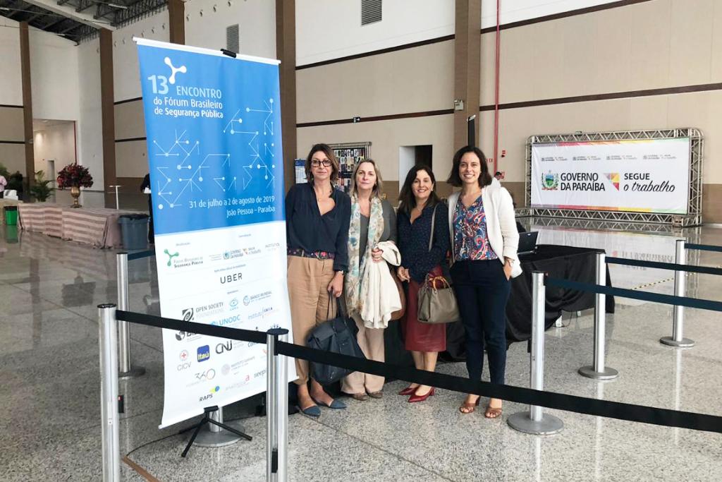 O Ministério Público do Estado do Rio de Janeiro (MPRJ) participou do 13º Encontro do Fórum Brasileiro de Segurança Pública (FBSP), realizado entre os dias 31 de julho e 2 de agosto, no Centro de Convenções de João Pessoa, na Paraíba. O evento reuniu gestores públicos, policiais, membros dos MPs, integrantes do sistema judicial, sociedade civil e acadêmica, para objetivo de debater estratégias em busca da redução do crime, da violência e do medo no país. Na ocasião, o MPRJ esteve representado pelas promotoras de Justiça Eliane de Lima Pereira, assessora de Direitos Humanos e Minorias (ADHM/MPRJ), Elisa Fraga, coordenadora de Segurança e Inteligência (CSI/MPRJ), e Andréa Amin, coordenadora do Grupo de Atuação Especializada em Segurança Pública (GAESP/MPRJ), além de Joana Monteiro, coordenadora do Centro de Pesquisas (CENPE/MPRJ).