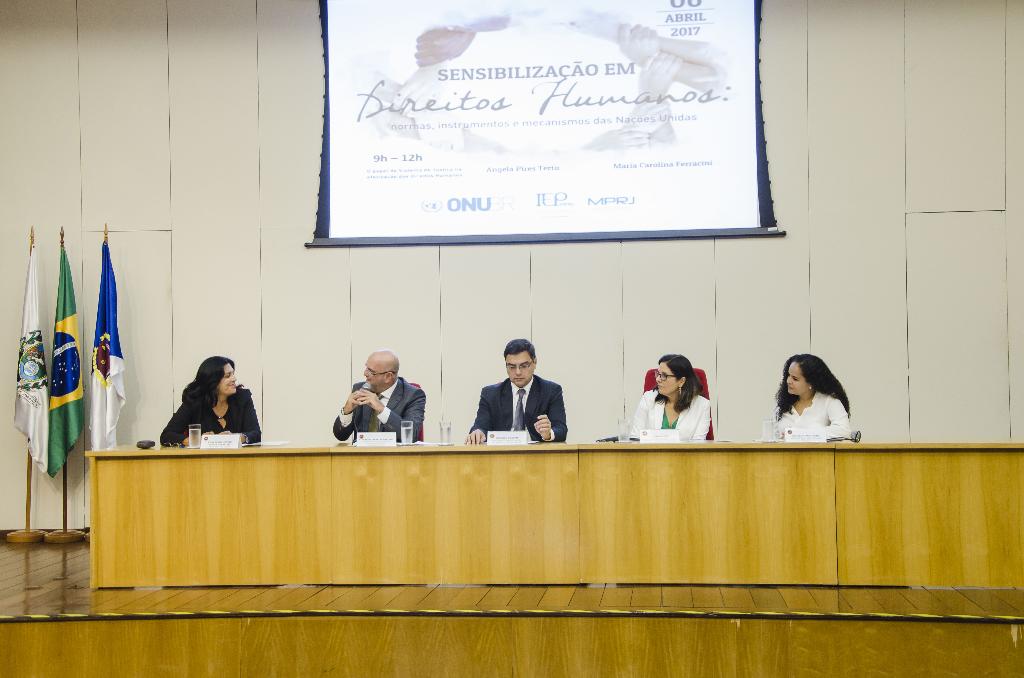 Sensibilizar e conscientizar procuradores e promotores de Justiça sobre a causa dos Direitos Humanos no Brasil e no mundo por meio da apresentação de relatórios e dados concretos da Organização das Nações Unidas (ONU). Com este objetivo foi realizado na sede do Ministério Público do Estado do Rio de Janeiro (MPRJ), na quinta e sexta-feira (06 e 07/04), o curso “Sensibilização em Direitos Humanos: normas, instrumentos e mecanismos das Nações Unidas”. O evento faz parte de uma parceria entre o MPRJ e a ONU. Representando a ONU participaram Ângela Pires Terto, assessora de Direitos Humanos da organização no Brasil e ponto focal do Alto Comissariado das Nações Unidas para DH, e Maria Carolina Ferracine, gerente de projetos da ONU Mulheres.
