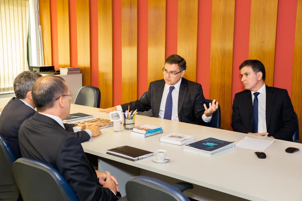 O procurador-geral de Justiça, Eduardo Gussem, recebeu, na manhã desta quinta-feira (05/03), visita do Superintendente da Polícia Federal (PF) no Rio, o delegado Carlos Henrique de Sousa, do Corregedor Regional da PF no Rio, delegado Fabio Machado da Silva, e do chefe da Delegacia de Repressão a Crimes Contra o Patrimônio e ao Tráfico de Armas (DRCOR), delegado João Luiz de Araújo. Os delegados e o PGJ conversaram sobre o enfrentamento ao crime organizado - sobretudo as milícias e facções -, trataram de possível intercâmbio de informações e foram apresentados a novas ferramentas de investigação e tecnologia elaboradas pelo parquet fluminense.