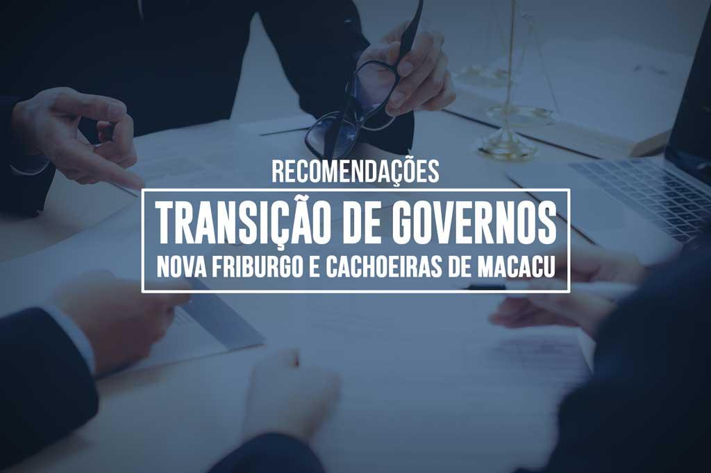 Foi recomendado aos atuais prefeitos que, no prazo de cinco dias úteis após o recebimento do documento, constituam equipes mistas de transição de governo, compostas preferencialmente por servidores efetivos das áreas jurídica, contábil, financeira e de controle interno, e por representantes, em número paritário, de indicados pelos prefeitos eleitos Johnny Maycon, no caso de Nova Friburgo, e Rafael Miranda, em Cachoeiras de Macacu. O objetivo é garantir que sejam fornecidos aos novos gestores os dados administrativos e financeiros dos respectivos municípios. Os próximos prefeitos, por sua vez, também deverão assumir o compromisso de adotar uma série de medidas a bem do serviço público e da defesa do erário municipal.